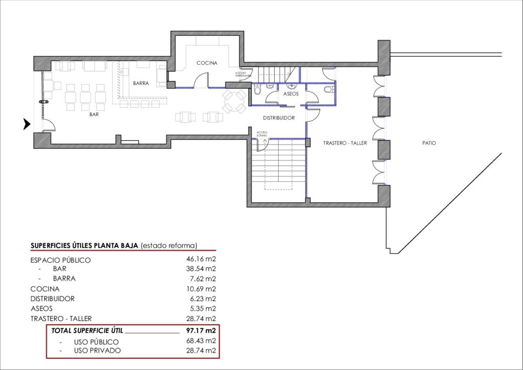 Planta Baja: superficie 102m2 divididos en zona mesas, cocina, aseos y almacén. La parte del almacén da a una terraza de un patio de manzana que le aporta mucha luz al local. Techos altos en la zona entrada.