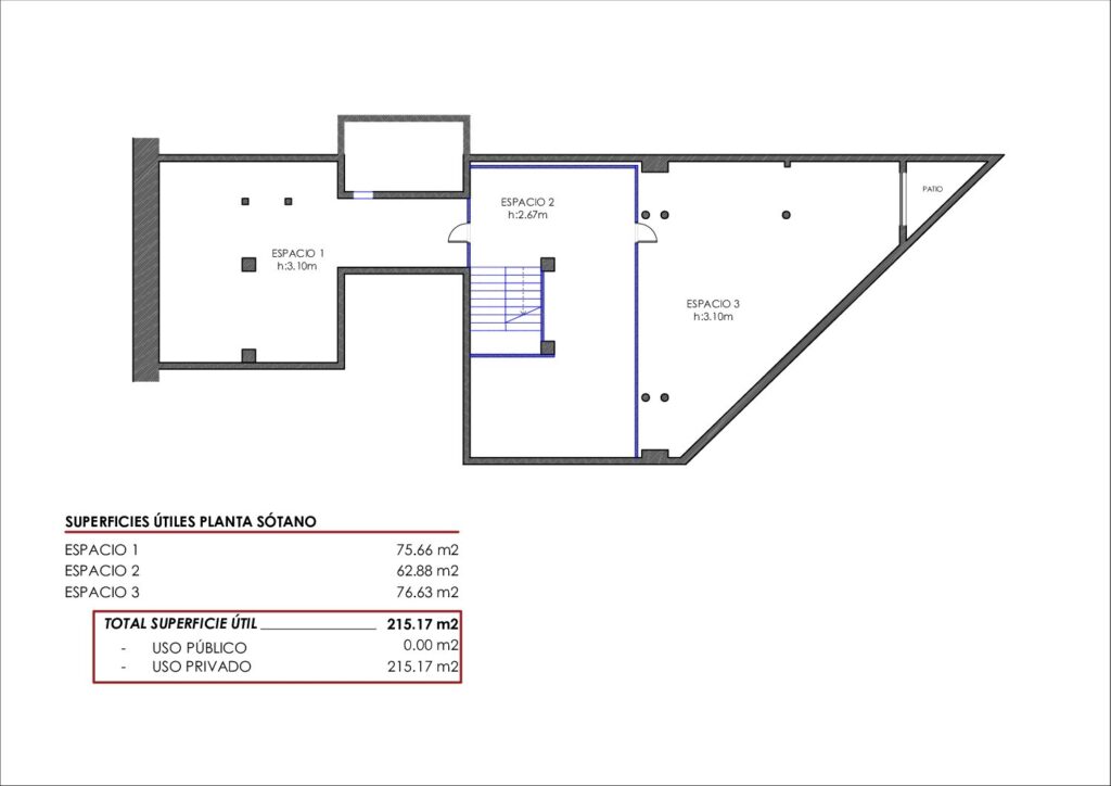 Planta Sótano: superficie 250m2 dividido en tres zonas muy diáfanas. Acceso mediante amplia escalera.