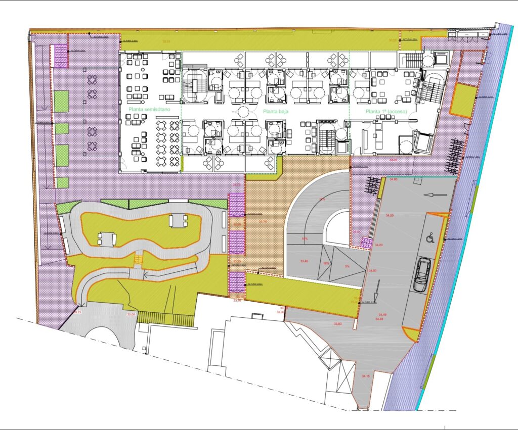 La intervención propone la construcción de un edificio de uso residencial asistencial, diseñado conforme a los criterios establecidos por la normativa urbanística municipal y la regulación específica de centros residenciales para personas mayores en la Comunidad Autónoma del País Vasco. El nuevo equipamiento alberga un total de 49 plazas, organizadas en unidades de convivencia distribuidas en tres plantas sobre rasante, garantizando un alto porcentaje de habitaciones individuales y priorizando la calidad espacial, la accesibilidad universal y el confort de las personas usuarias.