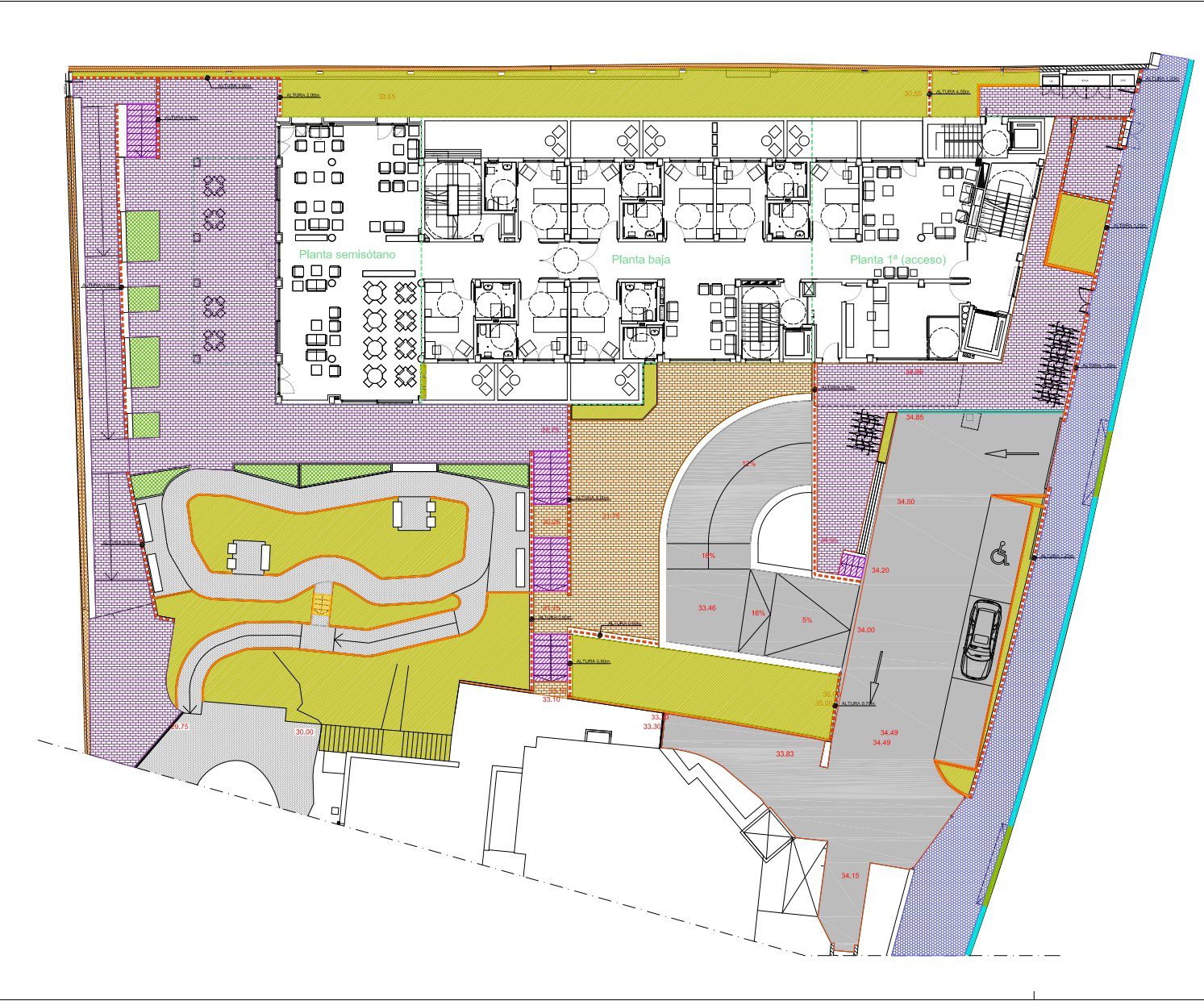 El edificio se articula en dos plantas bajo rasante destinadas a aparcamiento, instalaciones y servicios generales, y tres plantas superiores que concentran las áreas residenciales y espacios comunes. La organización funcional diferencia claramente los recorridos públicos, privados y de servicio, optimizando la operatividad del centro y reforzando la seguridad y el control de accesos. Todos los espacios habitables disponen de iluminación natural y ventilación natural, y se han diseñado amplias zonas de estancia y relación, tanto interiores como exteriores.